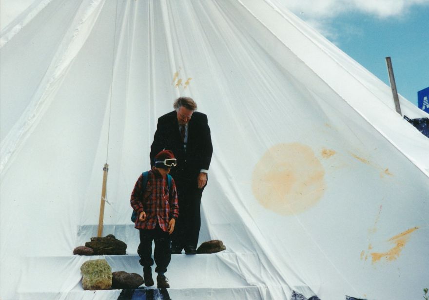Sir Edmund Hillary & Lady Hillary visited Feilding on Saturday 24th February 1996. The people of Feilding turned out to see Sir Edmund present certificates to Manchester Street School children, climb a calico Mount Everest in Manchester Square and be welcomed to Feilding. They both arrived at the Square in Peter Olsen's horse-drawn landau and left by helicopter for Kitchener Park. There they were welcomed by Hato Paoroa pupils before a crowd of about 500.