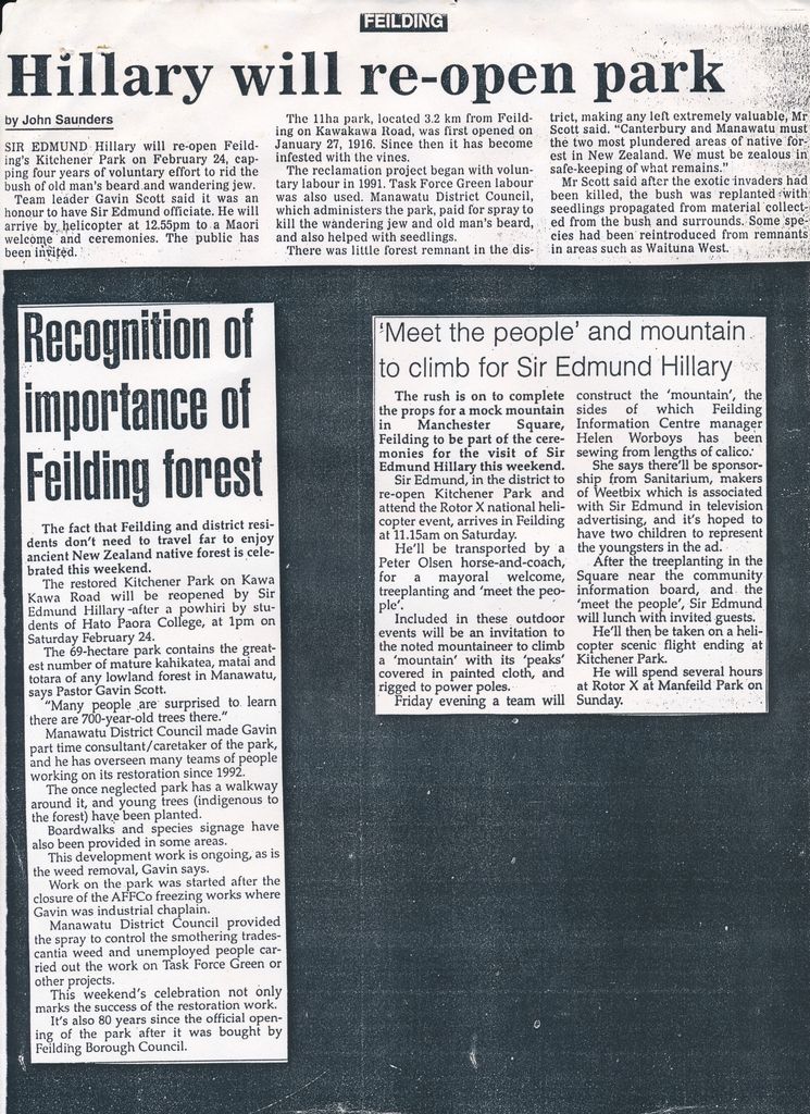 Sir Edmund Hillary & Lady Hillary visited Feilding on Saturday 24th February 1996. The people of Feilding turned out to see Sir Edmund present certificates to Manchester Street School children, climb a calico Mount Everest in Manchester Square and be welcomed to Feilding. They both arrived at the Square in Peter Olsen's horse-drawn landau and left by helicopter for Kitchener Park. There they were welcomed by Hato Paoroa pupils before a crowd of about 500.