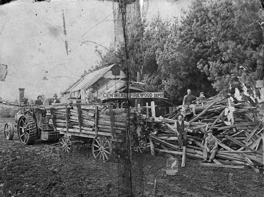The Central Firewood Depot, originally located on Denbigh Street. In the photo is George Solomon Smith and Suzan (sic) Smith (the small child sitting on the wood pile). Photographed by J. F. Macedo.