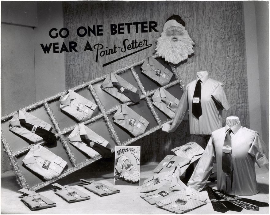 Simplicity is the keynote of this display. Pastel toned shirts are geometrically arranged on a board covered with brght red and green squares. The background is of wood paper and the floora natural shade. A Father Xmas head, silver tinsel and the show card give the festive atmosphere