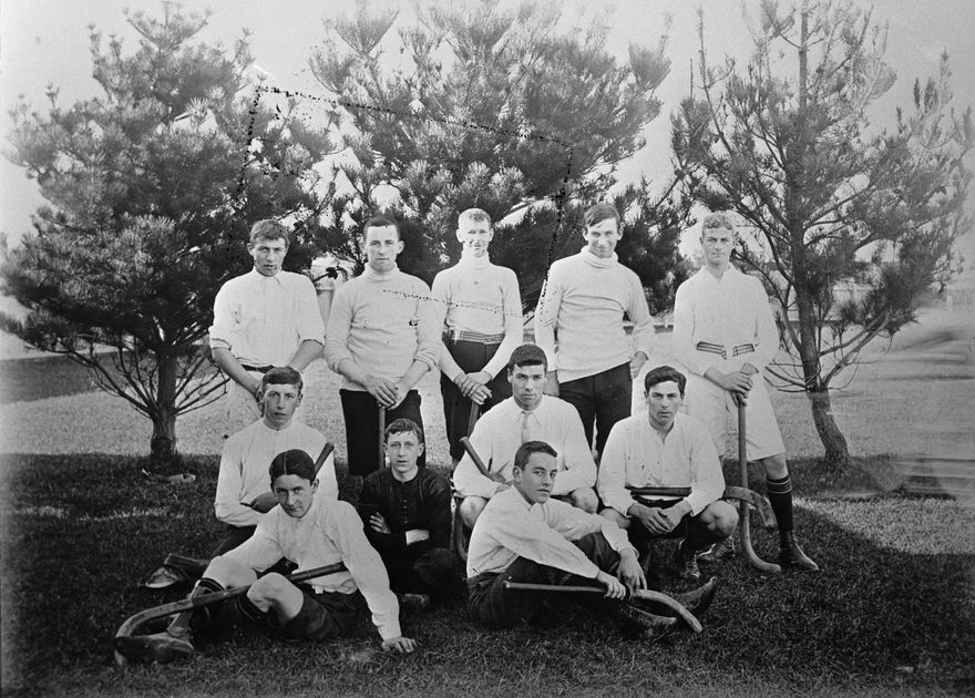 Feilding Hockey Team, 1907. Back Row: -, -, J. Cornfoot, -, B. Watson. Centre Row: -, -, -. Front Row: -, B. Hobday, -, ? Hostick.