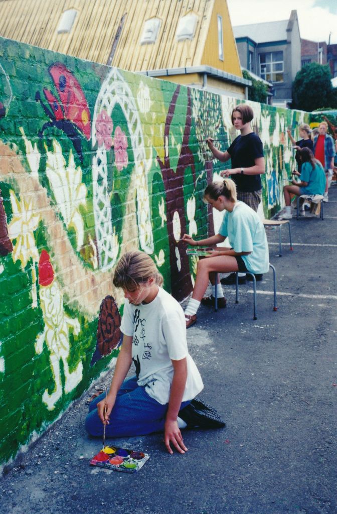 A group of junior artists painting the wall of Macdonalds driveway.