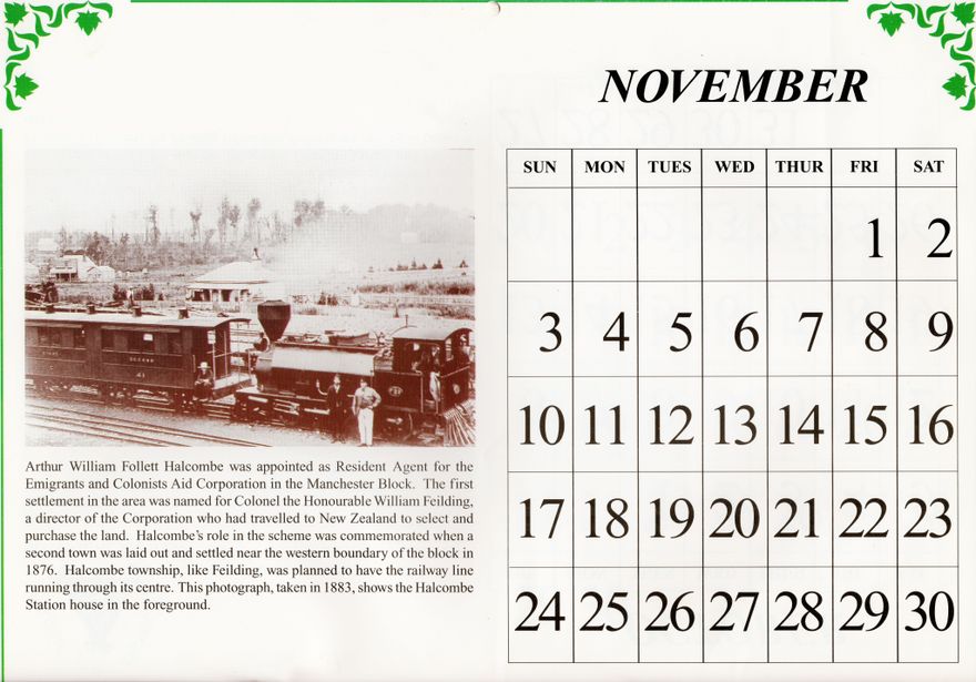 Calendar produced by The Feilding And Districts Historical Society showing early photographs of Feilding landmarks, then photographs taken in 1996. Descriptions of photographs have been added. Colour Photographs taken by I B Mandahl Limited. Early Photographs - I B Mandahl Ltd and the Feilding Public Library