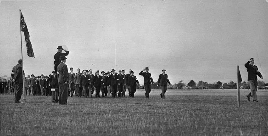 Feilding Home Guard Parade, 10th May, 1941. Commander M. I. Nalleiter leads a parade of approximately 1000 men.