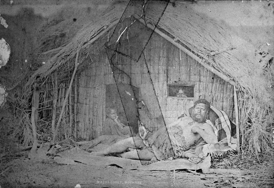 This postcard shows an image of Te Rangi Tahau, lying on the porch of a whare puni. His wife, Ngaikiha Te Raukura peers out the window, while one of his sons sits in the doorway. Te Rangi Tahau holds a patu (Totoringa) in his hand. Te Rangi Tahau was at one time a follower of Te Kooti, but at the time of this photograph it is believed he was living peaceably on the shores of Lake Taupō, at Waipahihi. Te Rangi Tahau was the son of Ngawaka Te Kohanga Tahau and Parekaui Teito Wairoroki. He had two sons, one of whom was named Paora Tahau. A clearer version of this photograph can be found at https://natlib.govt.nz/records/22780489.