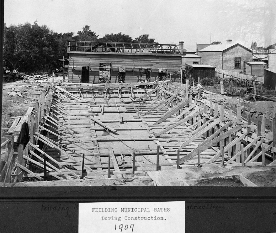 Feilding Municipal Baths underwent construction in 1908, but it wasn't until 1909 that they were completed. September 1972 saw the opening of the new swimming baths on the opposite side of Manchester Street. The old baths, seen here, underwent demolition in 1974 and later that year a children's skating rink was opened on the old site.