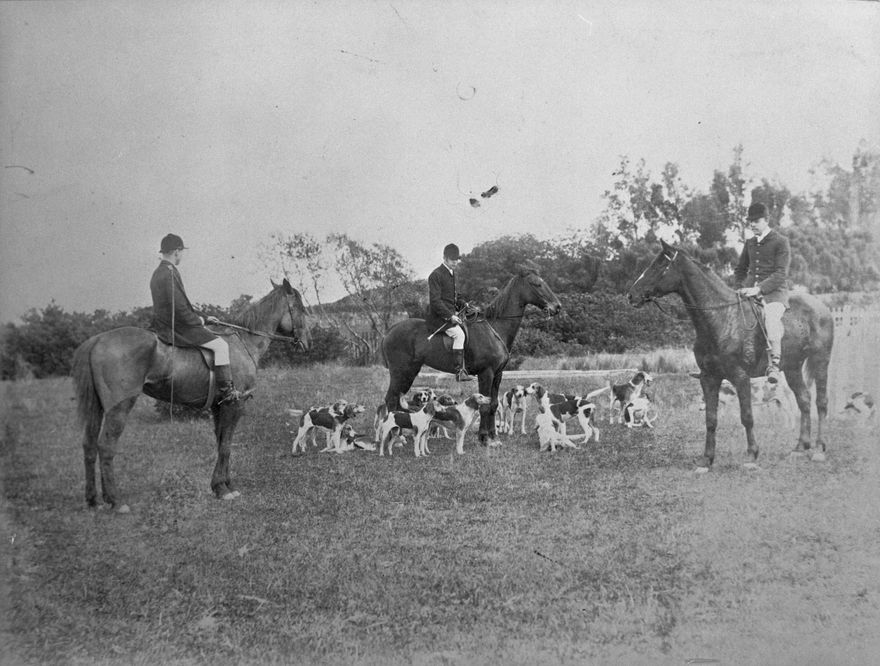 Hounds, horses, and their handlers from the Manawatu Hunt Club. Date and photographer unknown.