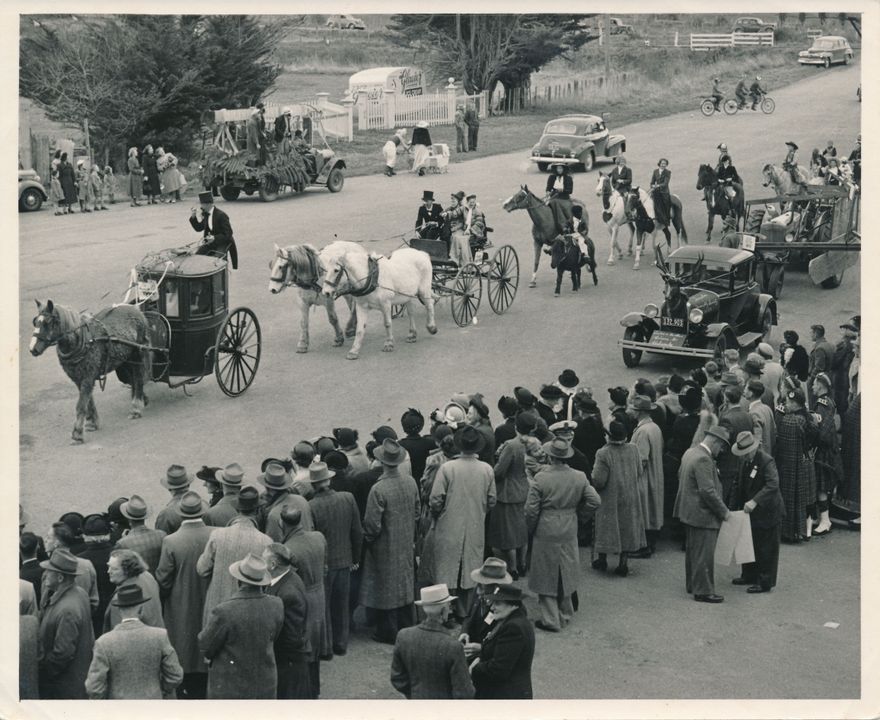 These photographs show images from the parade held to celebrate Halcombe School's 50th Jubilee, in 1937. A marching band, various floats, and the crowd are all shown.