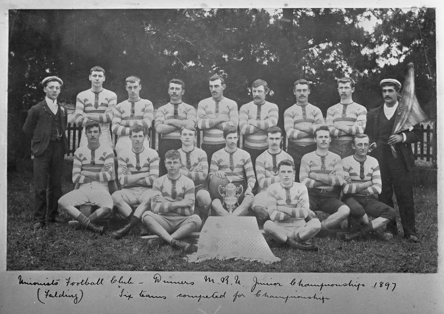 Written on bottom of photograph: Unionists Football Club, winners M.R.U. Junior championship 1897. Six teams competed for the championship.