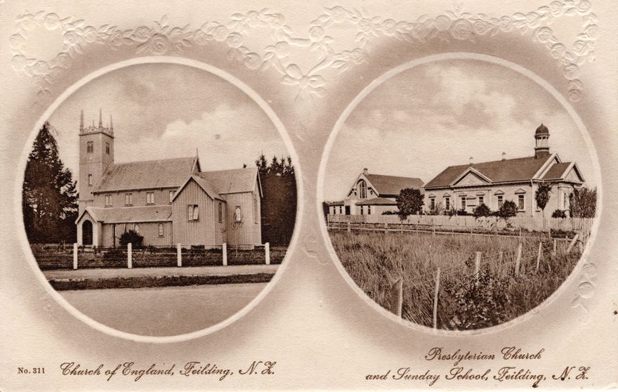 Postcard of the Church of England, Feilding Presbyterian Church and Sunday School, Feilding