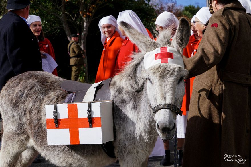 A Red Cross donkey with nurses at the parade.