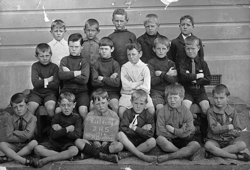 Manchester Street School - 1914. Left to right:- Back Row: -Jones, Noel Penny, Gilbert Read,-Hight. Centre Row: Stewart Matheson, Ron Eade, Deslie Moore,......, Leo Mansell, Hardie Murdoch. Front Row: L. Bilderbeck, ....., ....., Noel Strawbridge, -