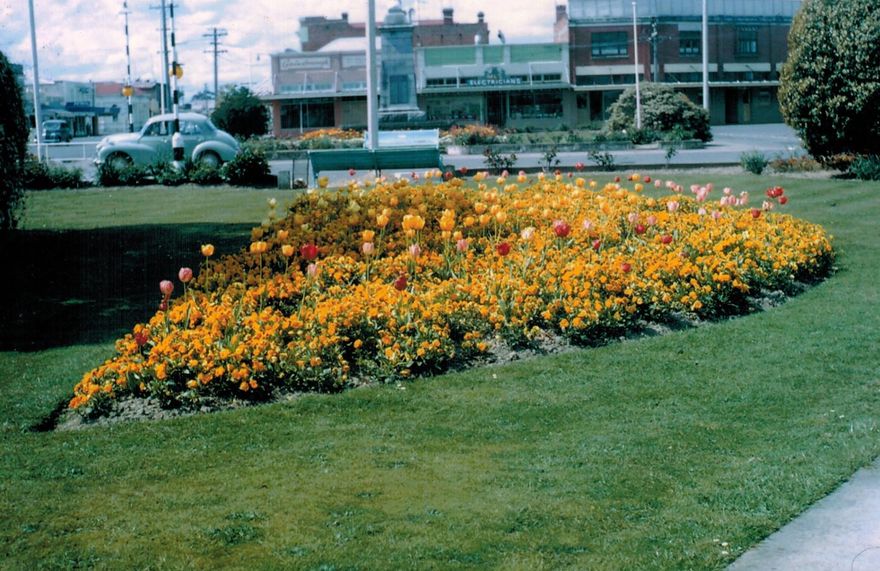 Manchester Square, between Manchester Street and Kimbolton Road. Where the garden is we now have toilet blocks. In the background M&S Electricians (McLeod & Svendsen) Gainsborough Ladies Fashions (now BNZ bank 2016).