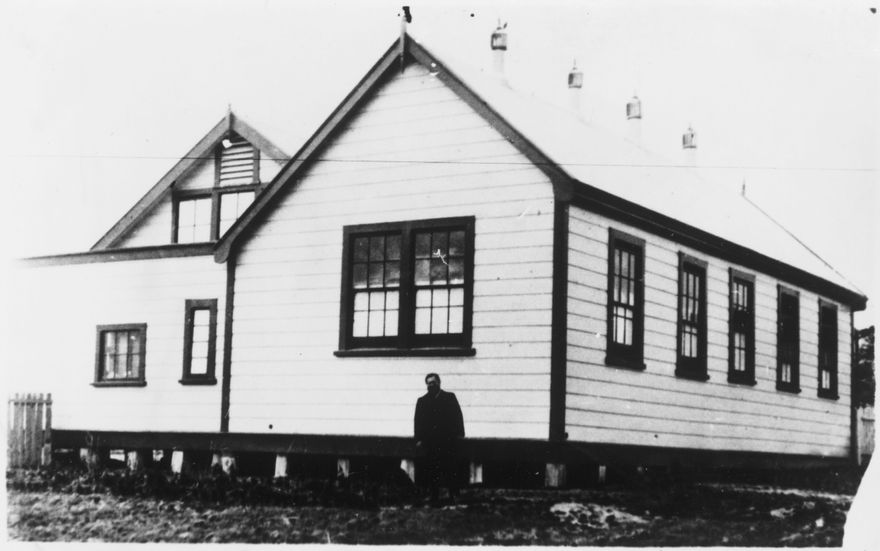 Bunnythorpe School photographed in 1900, with Mr. Espiner (possibly the headmaster) standing out front.