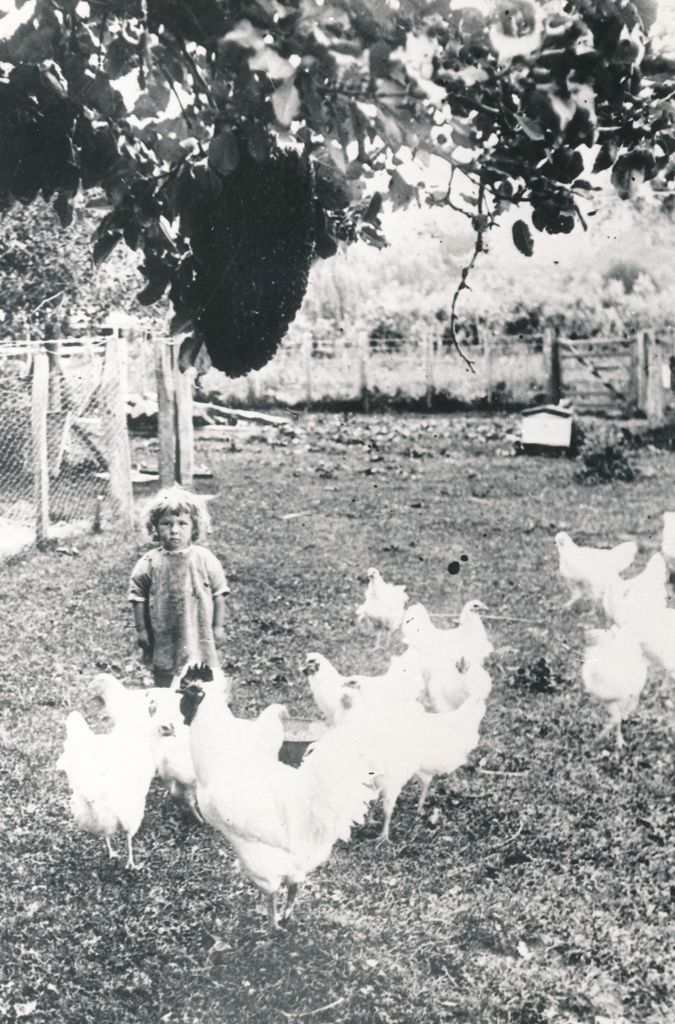 One of Charles Wildbore's children surrounded by chickens, on the family farm in Pohangina. Wildbore was a well-known amateur photographer during the early 1900's, as well as owning a small dairy farm and apiary.