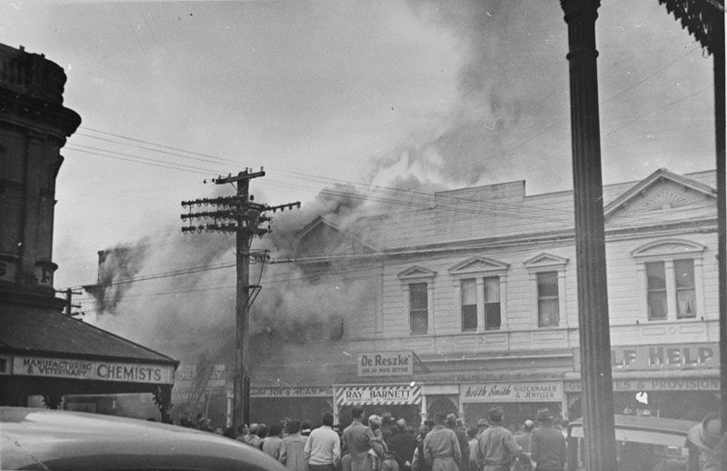 Photograph showing: Keith Smith Jewellers - Barry Smith (son now 2017) Self Help (Grocery Shop)Ray Barnett (sign above his shop - a brand of cigarettes) Manufactoring & Veterinary Chemist (on corner of Goodbehere & Fergusson Streets) Photograph taken from Goodbehere Street