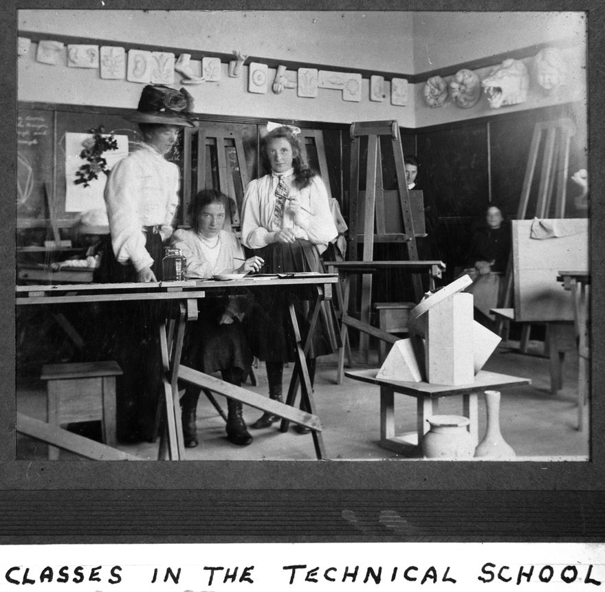 A photograph of two students and teacher taken at Feilding Technical School, perhaps for promotional reasons.