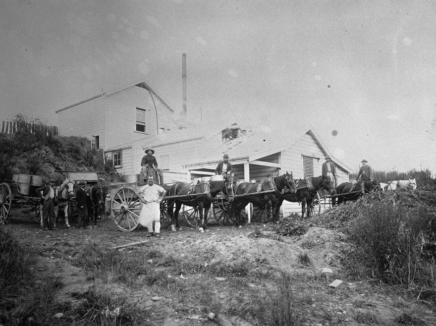 Staff of the Rangiwahia-Ruahine Dairy Company standing outside the factory with teams of horses pulling carts presumably loaded with dairy products. The factory was built by L.G. West of Palmerston North early in 1898, and began production the following year. At that time it was managed by W.C. Dixon. Water power was introduced to the factory in late 1906.