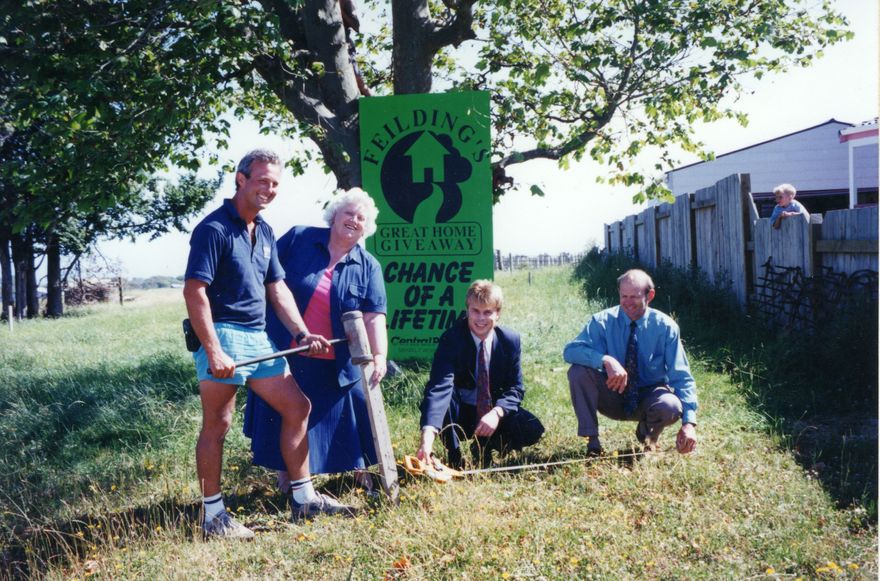 Feilding's Great Home Giveaway - Shop local for your chance of a Lifetime - Promotion for some of Feilding Businesses - shop in one of the shops that are supporting this promotion and save the receipt. For each accumulated $100 worth you will received a ticket in Feilding's Great Home Giveaway. You could win a 3 bedroom home with garage at 26 Vista Drive, Feilding plus a chance to win prizes in regular lucky draws. See the last photograph for more details of how to enter. The winning ticket was drawn by Mayor Caryll Clausen from a concerte mixer full of the 393,692 tickets. Number 470635 was the winner and held by Mrs Smith. Once the daw was over a ball at Highden Estate to mark the end of promotion, attended by nearly 100 people was held.