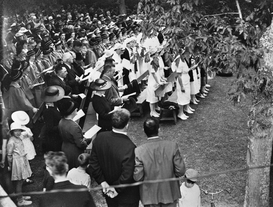 This gathering of people appears to be a church service of some kind, or perhaps a memorial service. Note the nurses dressed in white occupying the first three rows, indicating this was perhaps a military service. However, the actual specifics of this event are unknown.