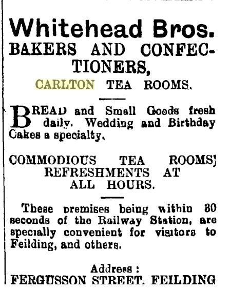 The Carlton Refreshment Building situated on Fergusson Street.(Right hand side looking at the Railway Station, between Stafford & Aorangi Streets). Business owned by the Whitehead brothers. See Feilding Star, 31 August, 1905.