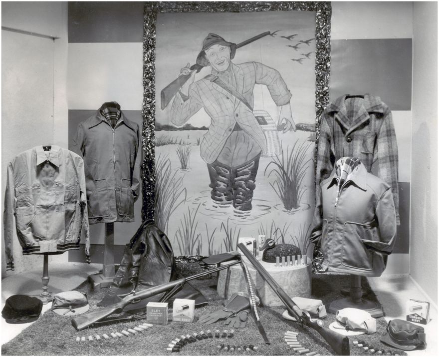 The shooting season promoted this window. On either side of the painted background which was framed with crinkled green foil were squares of green and yellow card. Various styles of wind-breakers, lumber jackets and caps were shown. Grass mats were on the floor and many shooting accessories were incorporated in the display.