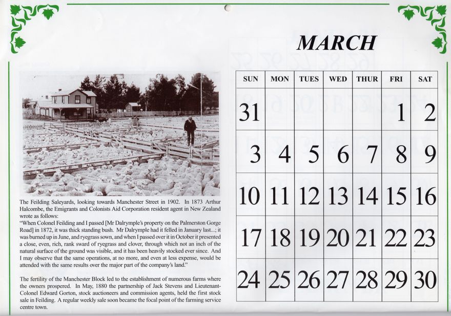In 1996, the Feilding and Districts Historical Society produced a 'Then and Now' calendar, comparing early photographs of Feilding landmarks with photographs taken that year. The photos, historical and recent, were taken by I B Mandahl Ltd and the Feilding Public Library.