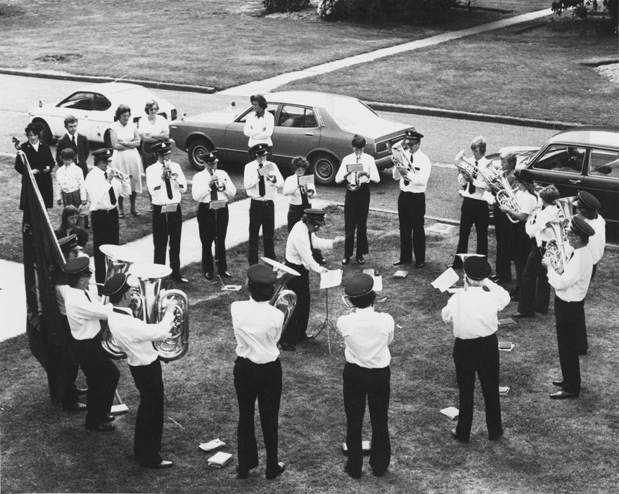 Feilding Salvation Army Band Playing at Lake Alice Hospital, Main Highway, North of Bulls. The hospital was opened in 1950 and shut down in 1999. This photograph was probably taken between the mid 1970s and mid 80s. All the cars in the photograph date from before this period.