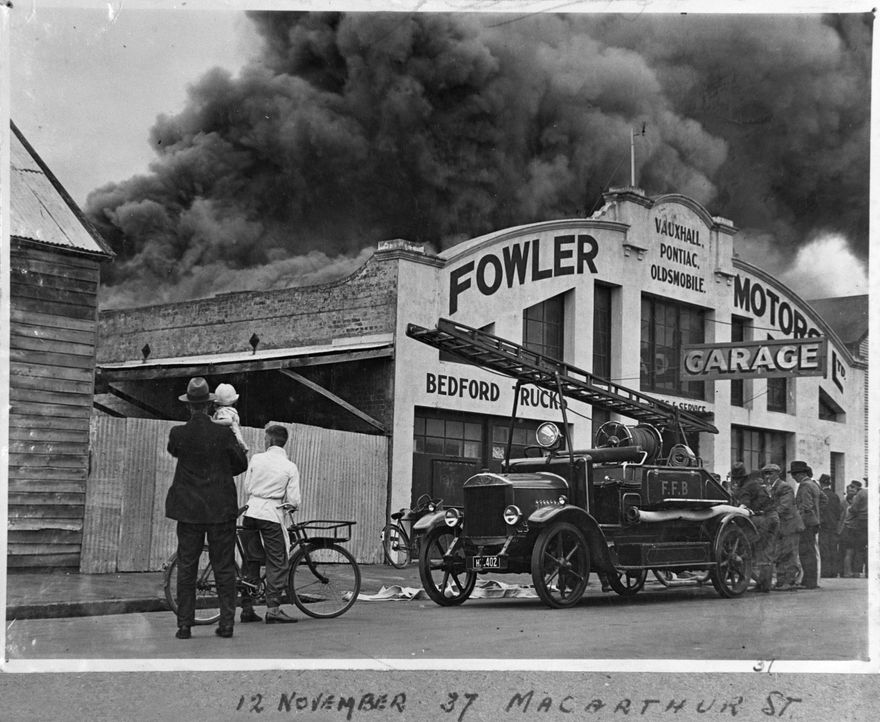 - On May 5 1942, a fire occurred at Fowler Motors Limited. The Feilding Fire Brigade attended the blaze. The site was occupied by Mark Panelbeating in 1983. - Photographer unknown.