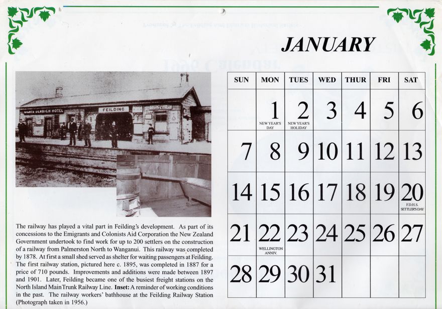Calendar produced by The Feilding And Districts Historical Society showing early photographs of Feilding landmarks, then photographs taken in 1996. Descriptions of photographs have been added. Colour Photographs taken by I B Mandahl Limited. Early Photographs - I B Mandahl Ltd and the Feilding Public Library