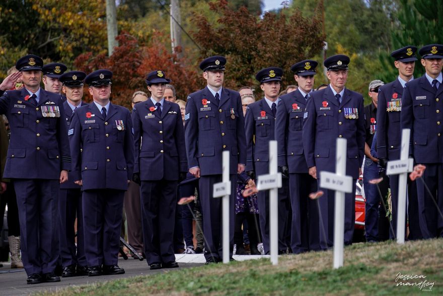 Royal New Zealand Air Force men and women led in salute by a wing commander.