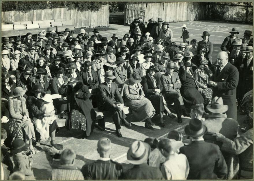 Me E.F. Hemingway, Chairman of the Education Board talking to past and present pupils of the Cheltenham School
