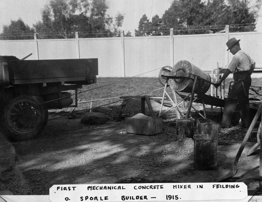 A builder who is believed to be either O. (Oliver?) Sporle or Alf Sporle* operates the first mechanical concrete mixer used in Feilding, in 1915.