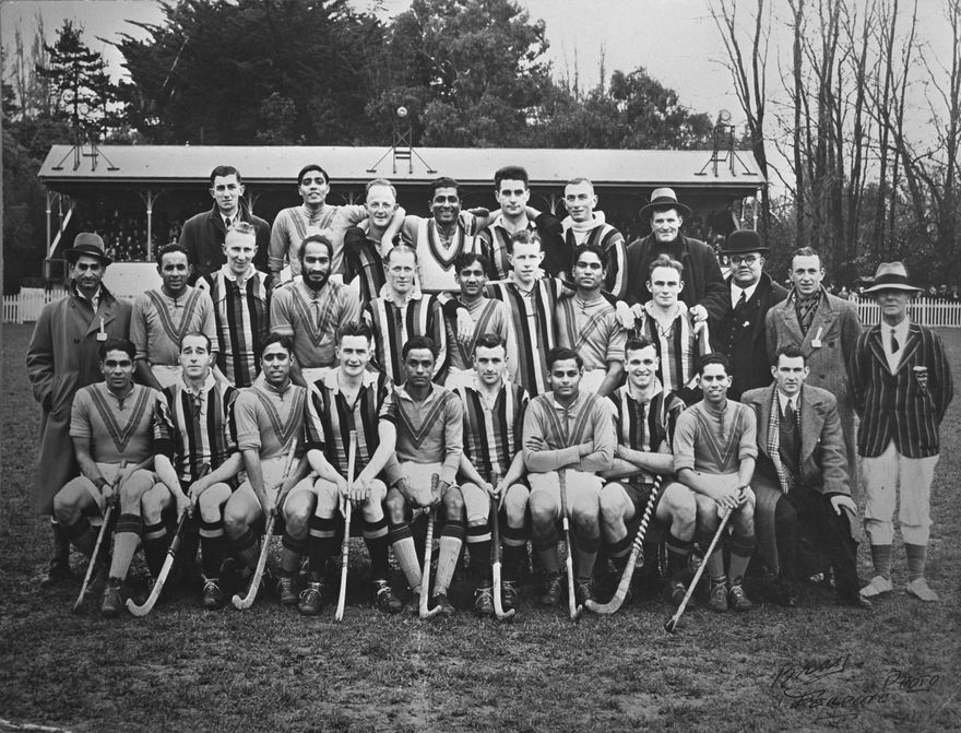 The Prince of Manavadar's State Hockey Team plus some Feilding players, in 1938 at Johnston Park, Feilding.