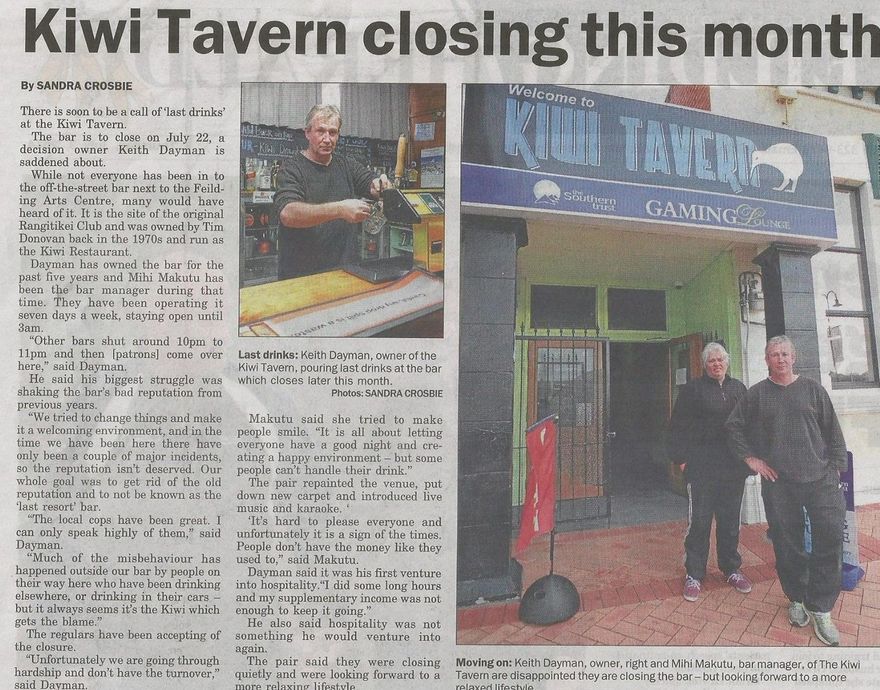 Part of an article in the Manawatu Standard. Contrary to the article the shutting of the Kiwi Tavern was on 27th July