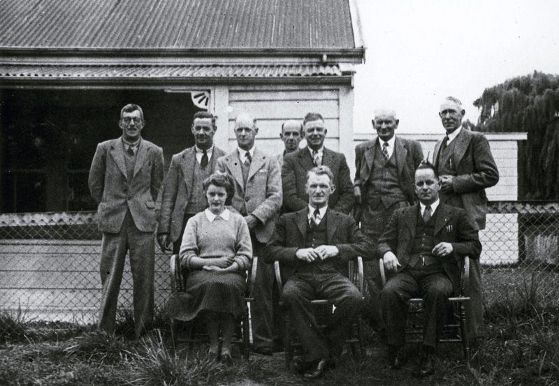 Standing, left to right: Cr. H.G. Arbon, County Overseer H.E. Pitt, Cr. J.W. Brown, Cr. J.H. Cowan, Cr. H.C. McIntyre, Cr. P.W. Jensen, Cr. H.B. Clapham. Sitting, left to right: Miss Jennifer Klink (County Clerk/Typist), Chairman N.H. Moar, County Clerk A.W.E. Bragg.