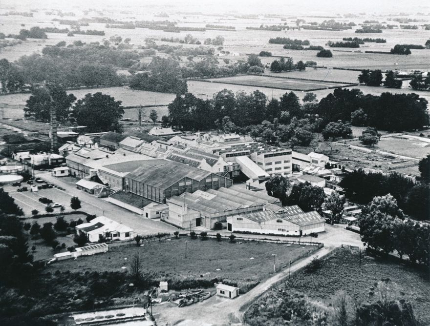 Aerial view of Borthwicks Freezing Works, situated off Aorangi Road, Feilding. Date on back - early 1950's