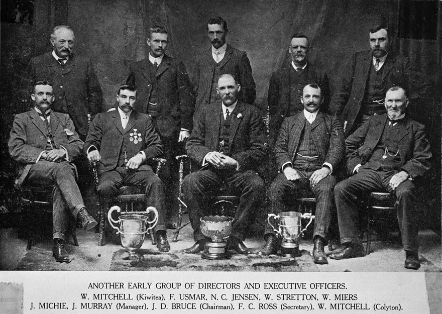 Another early group of Directors and Executive Officers. W. Mitchell (Kiwitea), F. Usmar, N.C. Jensen, W. Stretton, W. Miers. J. Michie, J. Murray (Manager), J.D. Bruce (Chairman), F.C. Ross (Secretary), W. Mitchell (Colyton).