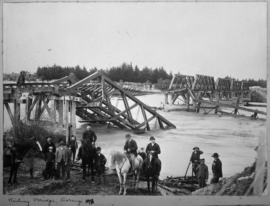 The traffic and railway bridges across the Oroua River at Aorangi suffered considerably under the heavy flood waters on April 17th, 1897. The approaches to the Railway Bridge on the Feilding side of the river went with three short spans of the bridge, the iron piers resisting force of the current remarkably well. The only connection left between the two sides of the river were the Railway irons and sleepers, which remained swinging the air. Two spans of the Road Bridge on the Feilding side of the river went, leaving six standing without any apparent damage. The two spans which were washed away stranded about a quarter of a mile away down the river.