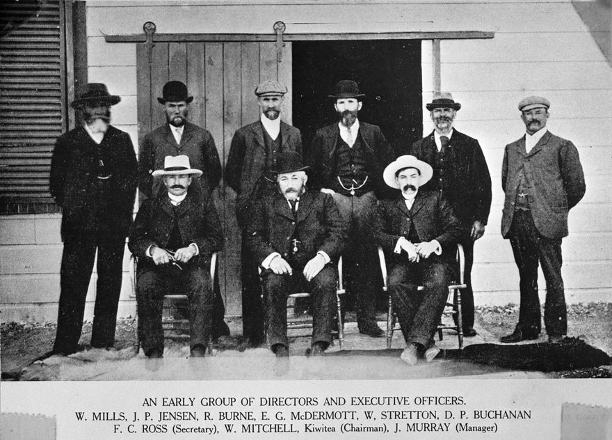 An early group of Directors and Executive Officers. W. Mills, J.P. Jensen, R. Burne, E.G. McDermott, W. Stretton, D.P. Buchanan. Seated: F.C. Ross (Secretary), W. Mitchell, Kiwitea (Chairman), J. Murray (Manager).