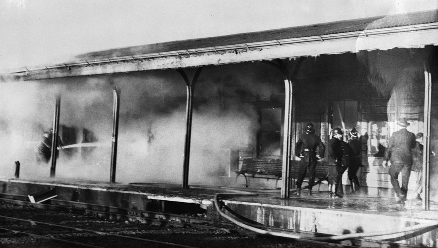 Firefighters control the blaze at Feilding Railway Station, 29th July, 1960. The building was badly damaged and parts were completely destroyed. A year and a half later, on the 7th of December 1961, the station was officially reopened.