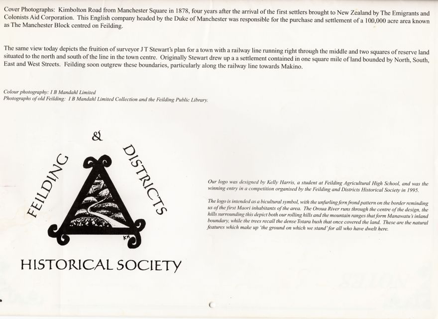 Calendar produced by The Feilding And Districts Historical Society showing early photographs of Feilding landmarks, then photographs taken in 1996. Descriptions of photographs have been added. Colour Photographs taken by I B Mandahl Limited. Early Photographs - I B Mandahl Ltd and the Feilding Public Library