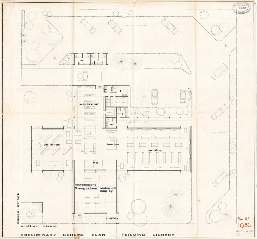 Architectural plans for the Feilding Public library building on the corner of Bowen and Stafford Street. These were drawn for the Feilding Borough Council in 1975, by architect Lindsay Durrant.