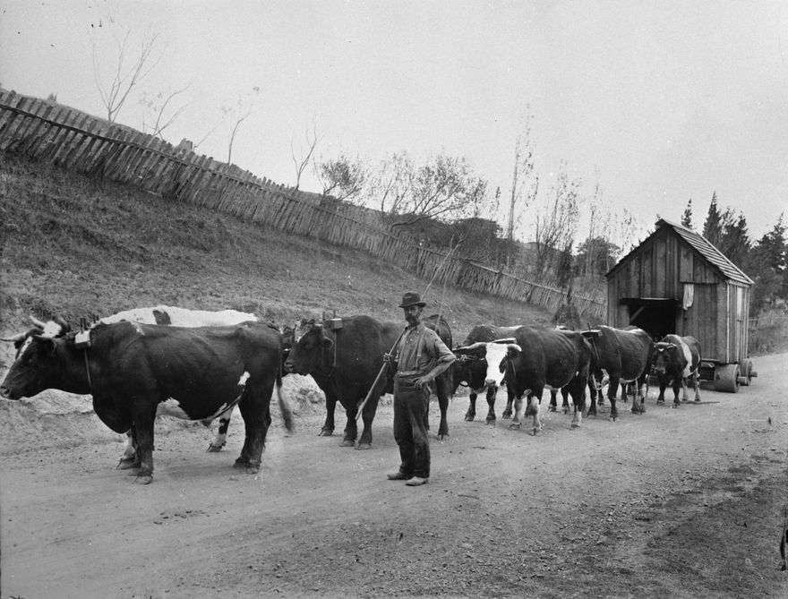 A bullock team shifting a pioneer's cottage, photographed on West Street in 1912.