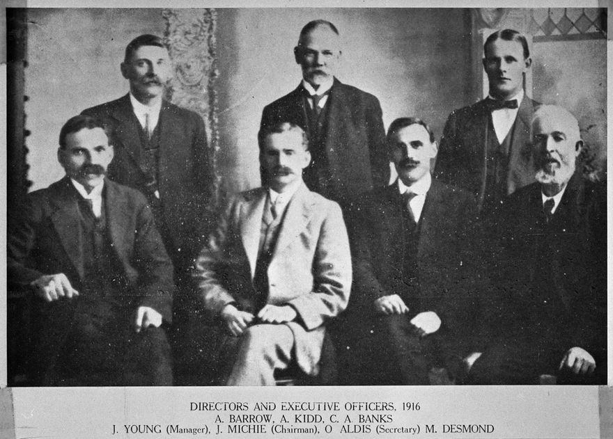 Directors and Executive Officers, 1916. A. Barrow, A. Kidd, C.A. Banks. I. Young (Manager), J.Michie (Chairman), O. Aldis (Secretary), M. Desmond.