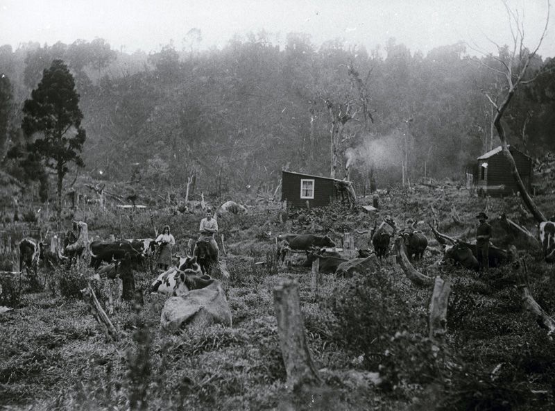 This photograph was part of the accumulation making up the Pohangina Collection. There was no information accompanying it so the image may not even be of the Pohangina area. The photograph is almost certainly one of a family farm rather than a temporary bush dwelling. Five people can bee seen - a bearded man to the far right, a younger child to his left standing between two cattle, a woman standing close to the cottage and a young man and woman centre left. The young man sits astride a cow with his arms folded, the woman beside him has her hands on her hips. It is tempting to see these gestures as proprietorial - we've felled the trees, sowed grass seed, brought in the cattle and mean to stay. The dwelling - shown more clearly in POH:40 - has net curtains at the windows, unlikely if this were a 'bush shanty.' Simon Johnson (2013)