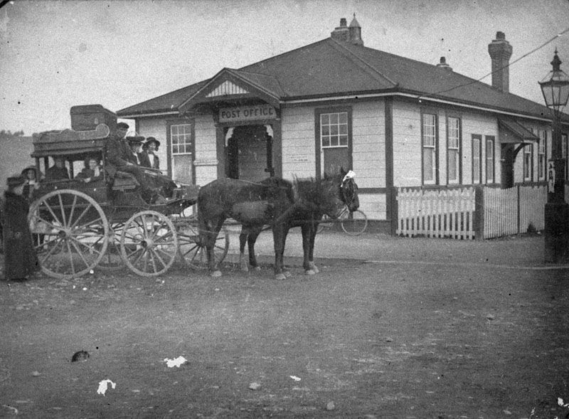 - This image shows a mail coach carrying passengers outside the Apiti Post Office. The date and creator of the photograph are unknown.
