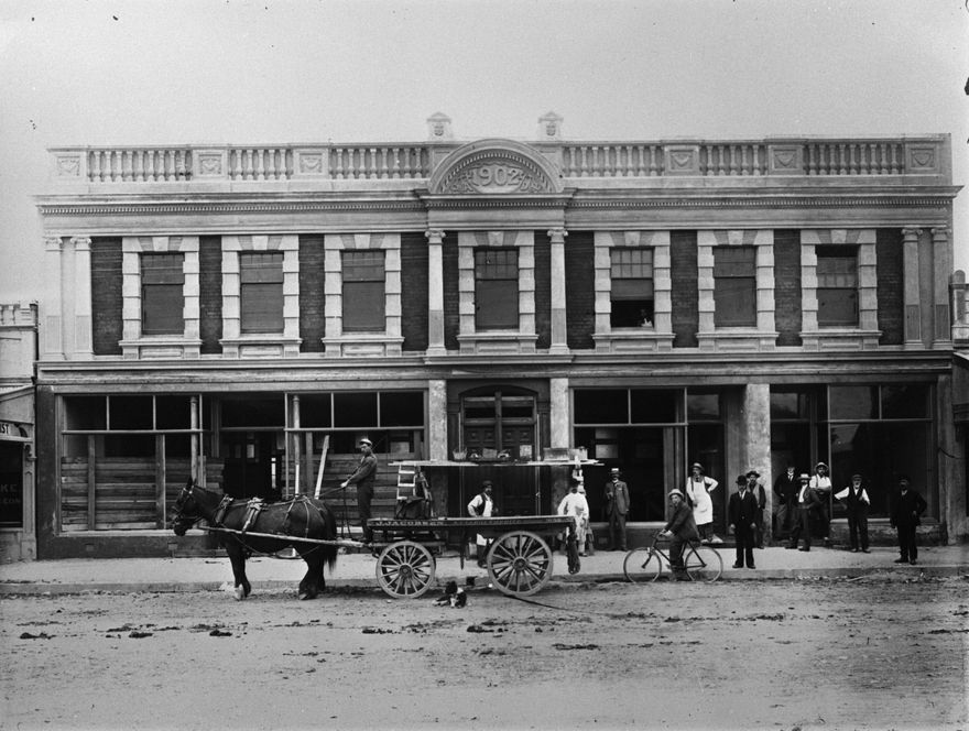 Sandilands Building, photographed after it's completion in 1902. The wagon reads "J. Jacobsen General Carries Licensed No. 59". This building, one of the many commissioned by respected lawyer and eventual mayor W. A. Sandilands, was built by William Wilkinson, the man standing on the far right in this photograph.